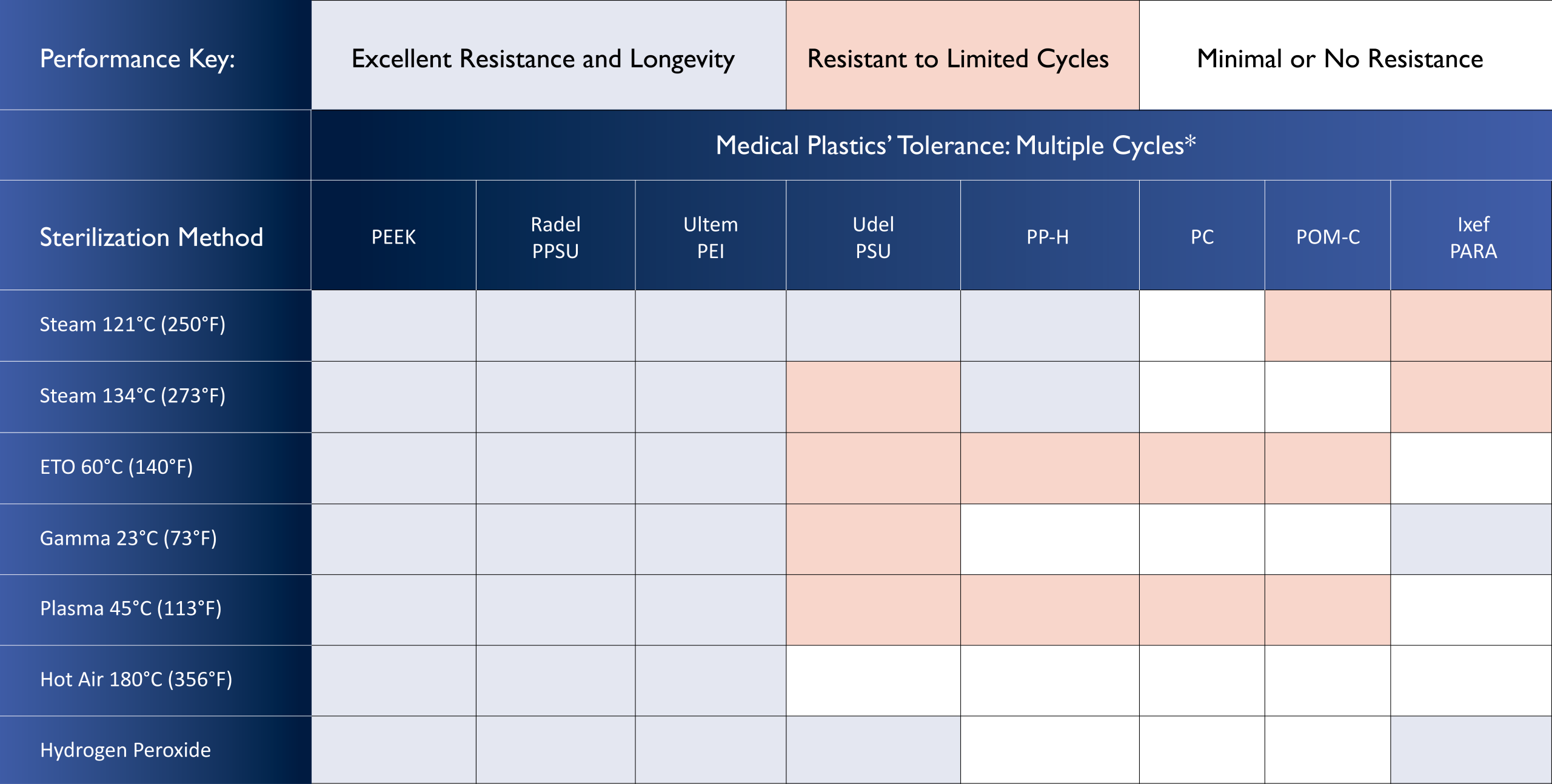 Table 1 approximates the tolerance of widely-specified medical plastics to various sterilization processes and cycles, and can serve as a general guide to help the designer narrow the range of options for an application. In all cases, it is strongly recommended that designers contact the resin supplier through Genesis or directly for definitive information on a material’s suitability for the intended sterilization procedure.